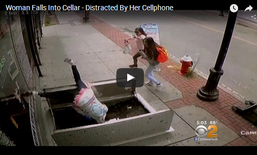 Што може да се случи ако на улица гледате во мобилниот покажува примерот на жена од Њу Џерси која паднала во шахта. На социјалните мрежи се појави видео снимка од нејзиниот пад во отворена шахта длабока неколку метри. Жената гледајќи во својот мобилен телефон не забележува дека вратата на шахтата е отворена и паѓа. Нема информација за повредите кои ги добила од падот.