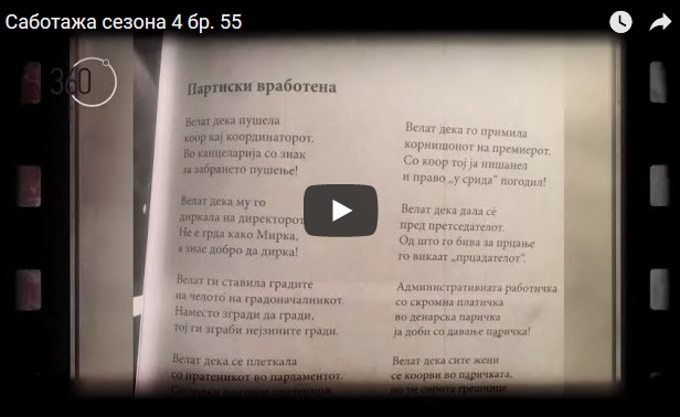 „АЛАРМантна“ Саботажа сезона 4 бр. 55 3Apr 2018Add a comment „АЛАРМантна“ Саботажа, емитувана на 02 април 2018 година (понеделник) на ТВ Алсат-М во емисијата „360 степени“. автор: Среќко Поповски монтажа: Коста А. СподелиTweetLike Loading...