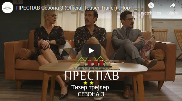 ПРЕСПАВ Сезона 3 (Трејлер) „Нов Газда“ 5Dec 2018Add a comment После успешните две сезони на хит серијата “Преспав” ќе следува и трета сезона. Премиерата ќе биде на 17 декември 2018година на МРТ1 од 20 часот и 15 минути Официјална најава за трета сезона на македонската ТВ серија “Преспав”. СподелиTweetLike Loading...