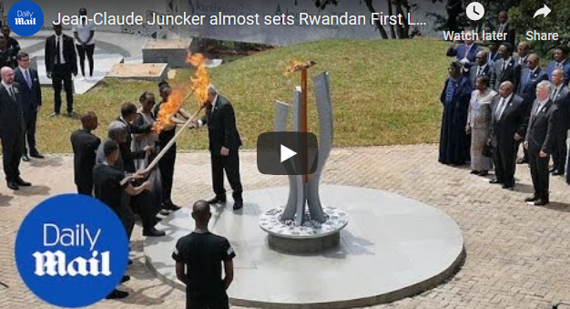 Првиот човек на Европската комисија Жан Пол Јункер, за време на церемонијата за оддавање почит на жртвите од геноцидот во Руанда пред 25 години, во кој беа убиени повеќе од 800.000 илјади луѓе, за малку ќе ѝ ја запалеше косата на сопругата на претседателот на Руанда, Пол Кагаме.