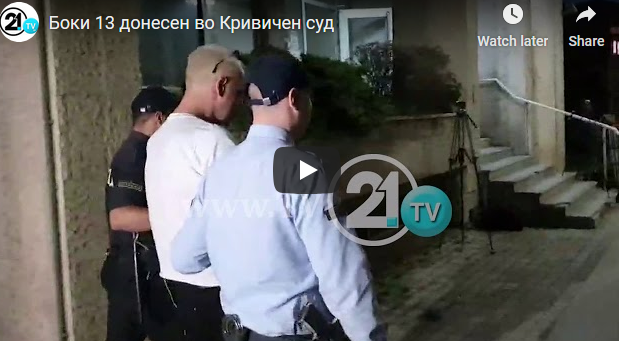 Бојан Јовановски познат како Боки 13 вечерва во придружба на полиција беше донесен во Кривичниот суд каде треба да започне распитот за него и за Зоран Милевски-Кичеец. Двајцата се осомничени дека зеле 1,5 милиони евра како награда за да влијаат врз јавен обвинител за да запре истрага против едно лице.