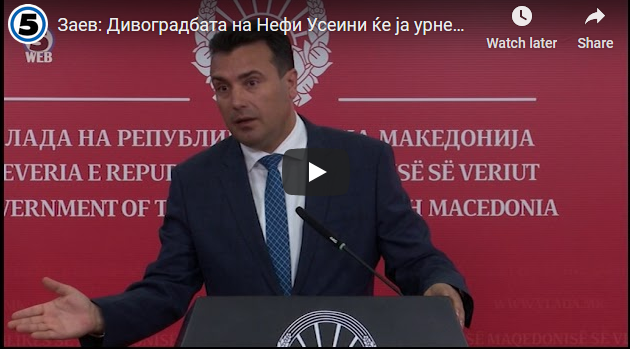 Заев: Дивоградбата на Нефи Усеини ќе ја урнеме! 17Jul 2019Add a comment Премиерот Заев на денешната прес конференција најави рушење на дивоградбата на Нефи Усеини. СподелиTweetLike Loading...