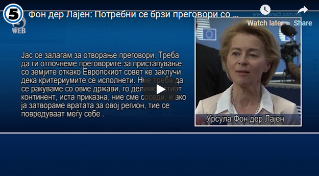 Фон дер Лајен: Потребни се брзи преговори со Македонија и Албанија 20Jul 2019Add a comment Веднаш откако Eвропскиот совет ќе оцени дека Mакедонија и Aлбанија ги исполнуваат потребните критериуми, треба да се отворат претпристапните преговори со овие земји. СподелиTweetLike Loading...