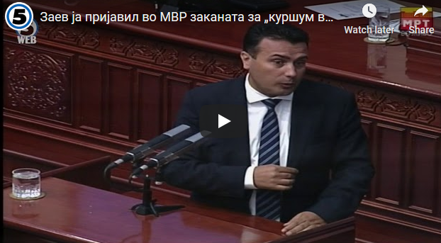 Заев пријавил во МВР закана за „куршум во глава” во коментар по пресот со Хан 25Jul 2019Add a comment Премиерот Зоран Заев денеска од собраниската говорница имнформира дека ја пријавил заканата, која во порака на социјалните мрежи била напишана во коментар по пресот со еврокомесарот за проширување Јоханес Хан. СподелиTweetLike Loading...