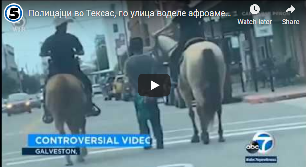 Полицајци во Тексас, по улица воделе афроамериканец врзан со јаже 7Aug 2019Add a comment Сцената на која двајца полицајци на коњи со јаже приведуваат Афорамериканец втор ден ја бранува американската јавност. СподелиTweetLike Loading...