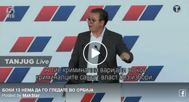 Претседателот на Србија Александар Вучиќ…БОКИ 13 НЕМА ДА ГО ГЛЕДАТЕ ВО СРБИЈА… 1Sep 20191 Sep 2019Add a comment Претседателот на Србија Александар Вучиќ , предизвика еуфорија на седницата на Главниот одбор на СНС …БОКИ 13 НЕМА ДА ГО ГЛЕДАТЕ ВО СРБИЈА…НЕМА СТРАНЦИ ДА МИ СОЛАТ ПАМЕТ КАКО ДА ИЗГЛЕДА ВЛАДАТА НА СРБИЈА… СподелиTweetLike Loading...