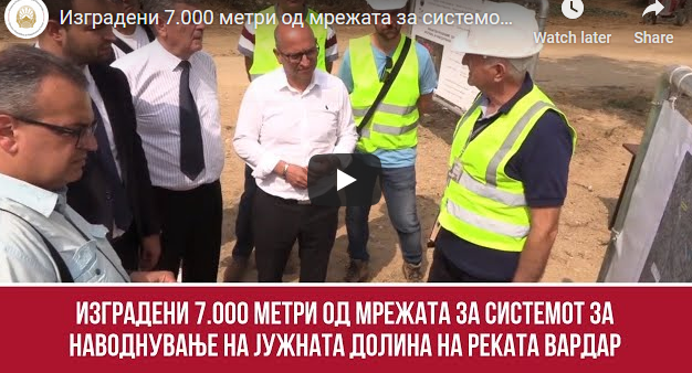За три месеци се изградени околу 7.000 метри од планираната секундарна мрежа (разводни цевководи), интензивно се поставува и терциерната мрежа за наводнување (дистрибутивни цевководи), а во полн ек е и изградбата на пумпната станица Јосифово, рече министерот за земјоделство, шумарство и водостопанство, Трајан Димковски по денешната посета на системот „Јужновардарска долина“ кај Удово.