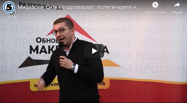 Мицкоски: Сите ќе одговараат, политичарите не се над законот 29Sep 2019Add a comment Лидерто на ВМРО-ДПМНЕ Христијан Мицкоски, синоќа од Битола, порача дека случајот „Рекет“ не може да се сведе само на тројцата осомничени. СподелиTweetLike Loading...