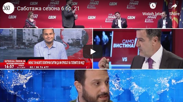 „Зумирана Саботажа“ сезона 6 бр. 21 27Nov 2019Add a comment „Зумирана Саботажа“, емитувана на 25 ноември 2019 година (понеделник) на ТВ Алсат-М во емисијата „360 степени“. автор: Среќко Поповски монтажа: Коста А. СподелиTweetLike Loading...