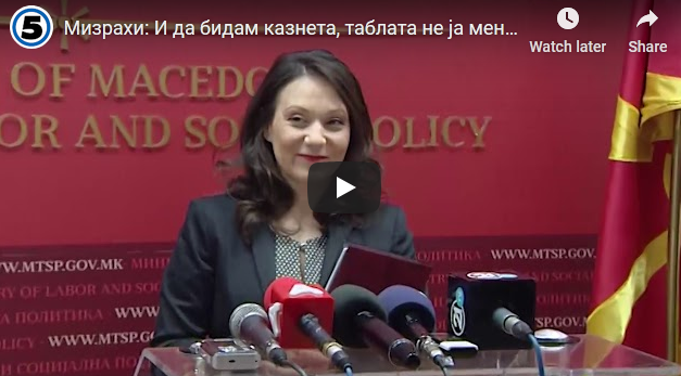 Мизрахи: И да бидам казнета, таблата не ја менувам 11Feb 2020Add a comment Министерката за труд Рашела Мизрахи е подготвена да плати и 5000 евра казна, но нема намера да ја смени таблата во министерството на која стои Република Македонија. СподелиTweetLike Loading...