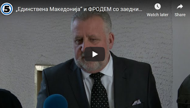 „Единствена Македонија“ и ФРОДЕМ со заеднички настап на изборите на 12 април 11Mar 2020Add a comment СподелиTweetLike Loading...