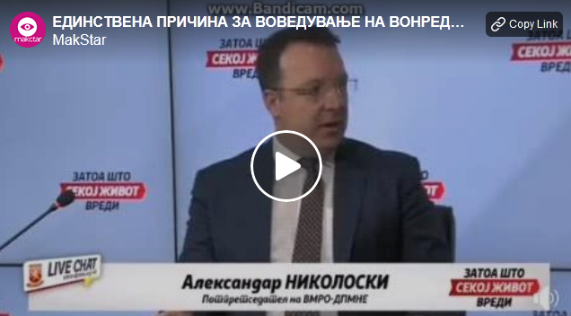 Александар Николовски …ЕДИНСТВЕНА ПРИЧИНА ЗА ВОВЕДУВАЊЕ НА ВОНРЕДНА СОСТОЈБА Е НОСЕЊЕТО НА ЗАКОНИ ВО ПОЛЗА НА ВИЦЕ ЗАЕВ… 19Mar 2020Add a comment Скандалозна изјава на Александар Николовски …ЕДИНСТВЕНА ПРИЧИНА ЗА ВОВЕДУВАЊЕ НА ВОНРЕДНА СОСТОЈБА Е НОСЕЊЕТО НА ЗАКОНИ ВО ПОЛЗА НА ВИЦЕ ЗАЕВ… СподелиTweetLike Loading...