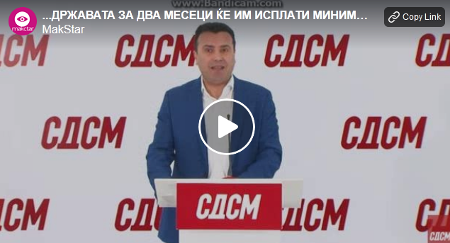 Заев …ДРЖАВАТА ЗА ДВА МЕСЕЦИ ЌЕ ИМ ИСПЛАТИ МИНИМАЛНА ПЛАТА НА СИТЕ ВРАБОТЕНИ ВО ФИРМИТЕ ПОГОДЕНИ ОД КРИЗАТА… 22Mar 2020Add a comment СподелиTweetLike Loading...