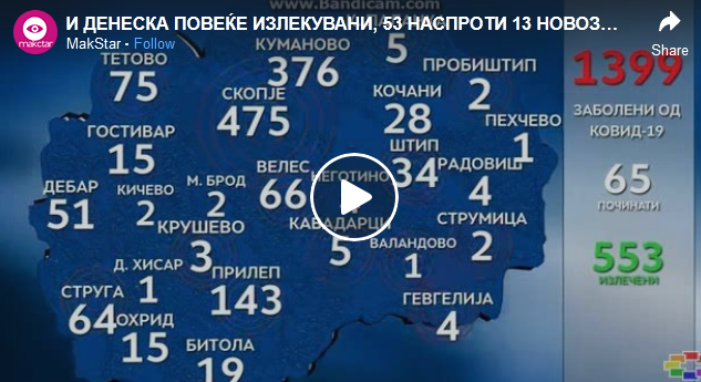 Состојба денеска 27.04.2020 – 53 излекувани, 13 новозаболени 27Apr 2020Add a comment СподелиTweetLike Loading...