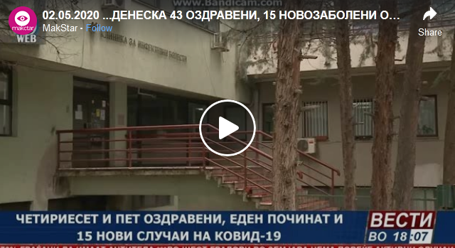 02.05.2020 …ДЕНЕСКА 45 ОЗДРАВЕНИ, 15 НОВОЗАБОЛЕНИ ОД КОВИД-19, НА КЛИНИКАТА ЗА ИНФЕКТИВНИ БОЛЕСТИ ЗА ПРВПАТ НЕМА ПРИЕМ НА НОВИ ПАЦИЕНТИ… 2May 2020Add a comment СподелиTweetLike Loading...
