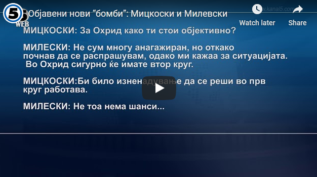 Објавени нови “бомби”: Мицкоски и Милевски се договарале за изборите во 2019? 8May 20208 May 2020Add a comment ЛИНК ДО СНИМКИТЕ НА YOUTUBE… СподелиTweetLike Loading...