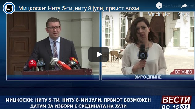 Мицкоски: Ниту 5-ти, ниту 8 јули, првиот возможен датум за избори е средината на јули 14Jun 2020Add a comment Лидерот на ВМРО-ДПМНЕ Христијан Мицкоски не ги прифаќа ниту петти, ниту осми јули за изборен датум.. СподелиTweetLike Loading...