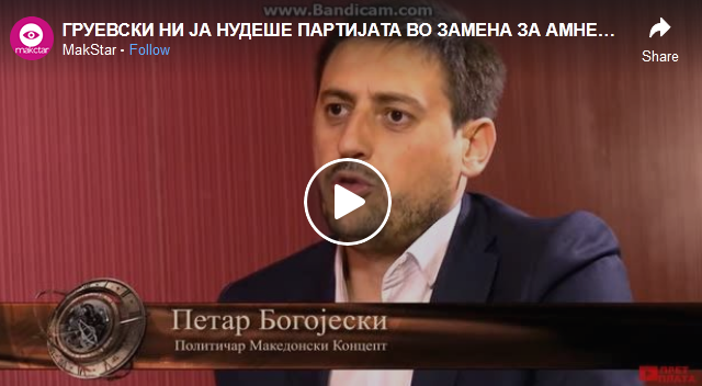 Петар Богојески …ГРУЕВСКИ НИ ЈА НУДЕШЕ ПАРТИЈАТА ВО ЗАМЕНА ЗА АМНЕСТИЈА ЗА НЕГО И НЕКОЛКУ НЕГОВИ БЛИСКИ СОРАБОТНИЦИ… 29Jun 2020Add a comment СподелиTweetLike Loading...