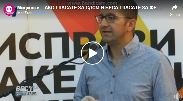 Мицкоски …АКО ГЛАСАТЕ ЗА СДСМ И БЕСА ГЛАСАТЕ ЗА ФЕДЕРАЛИЗАЦИЈА НА МАКЕДОНИЈА И НЕЈЗИНО УНИШТУВАЊЕ… 9Jul 2020Add a comment СподелиTweetLike Loading...
