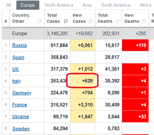 Последен пат на поголем дневен број на новозаразени од вирусот беше забележан на 23 мај (669). Колку за споредба, Италија пред само неколку недели имаше околу 200 нови случаи на ден. Бројот на починати од Ковид 19 во земјата е над 35.000 лица.