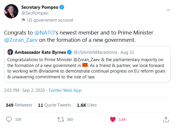-Честитки за најновата членка на НАТО и за премиерот Зоран Заев по формирањето на новата влада, напиша Помпео на Твитер.