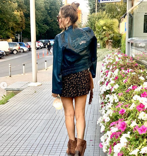 Во краток цветен фустан и кожна јакна Лила уживаше во почетокот на есента.