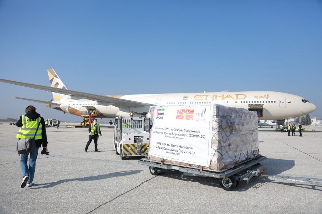 Десет тони помош за борбата против пандемијата предизвикана од коронавирусот пристигнаа вчера на аеродромот во Скопје. Помошта е во рамките на Емирејтс еид (Еmirates aid – Covid19 Global response) под покровителство на шеикот престолонаследник и заменик – врховен командант на вооружените сили на Обединетите арапски емирати, Мухамед Бин Зајед Ал-Нахјан, принцот на Абу Даби, соопшти Министерството за здравство.