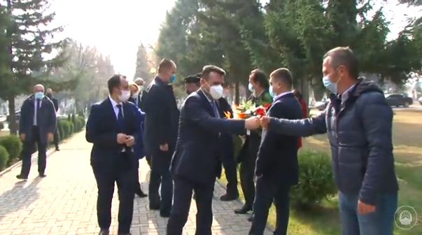 Во чест на борците кои на 13 ноември 1944 година ја донесоа слободата, членовите на Владината делегација оддадоа почит и положија цвеќе и на Алејата на заслужните и пред Споменикот на Ослободителите во дворот на Владата.