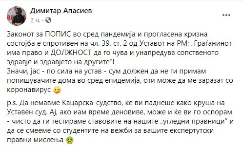 „Законот за ПОПИС во сред пандемија и прогласена кризна состојба е спротивен на чл. 39, ст. 2 од Уставот на РМ: „Граѓанинот има право и ДОЛЖНОСТ да го чува и унапредува сопственото здравје и здравјето на другите“! Значи, јас – по сила на Устав – сум должен да не ги примам попишувачите дома во сред епидемија, оти може да ме заразат со коронавирус “, пишува Апасиев.