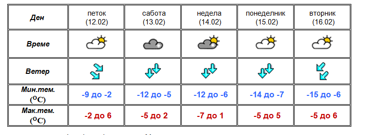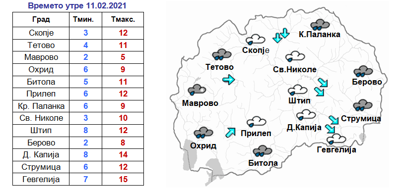 УХМР метео најава: Утре времето ќе биде облачно со врнежи од дожд, на места поројни и пообилни (над 20 л/м2) проследени со силен ветер (над 70 км/час). На планините на северозапад врнежите ќе бидат од снег. Попладне врнежите ќе преминуваат во снег и на некои повисоки места.Поради продор на многу студена воздушна маса од север утре попладне ќе почне да дува засилен северен ветер, кој ќе се задржи и во следните денови и ќе услови значително заладување. Во деновите од викендот ќе биде многу студено со врнежи од снег. На планините ќе се зголеми снежната покривка.Утринските температури на места ќе се спуштат и до минус 12 степени, а и дневните на повеќе места ќе се задржат под нулата.