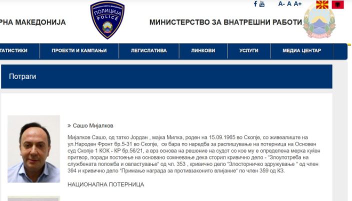 „Мијалков Сашо, од татко Јордан , мајка Милка, роден на 15.09.1965 во Скопје, со живеалиште на ул.Народен Фронт бр.5-31 во Скопје, се бара по наредба за распишување на потерница на Основен суд Скопје 1 КОК – КР бр.56/21, а врз основа на решение на судот со кое му е определена мерка куќен притвор, поради постоење на основано сомневање дека сторил кривично дело – “Злоупотреба на службената положба и овластување“ од чл. 353 , кривично дело “Злосторничко здружување “ од член 394 и кривично дело “Примање награда за противзаконито влијание“ по член 359 од КЗ.“, стои во потерницата на МВР.