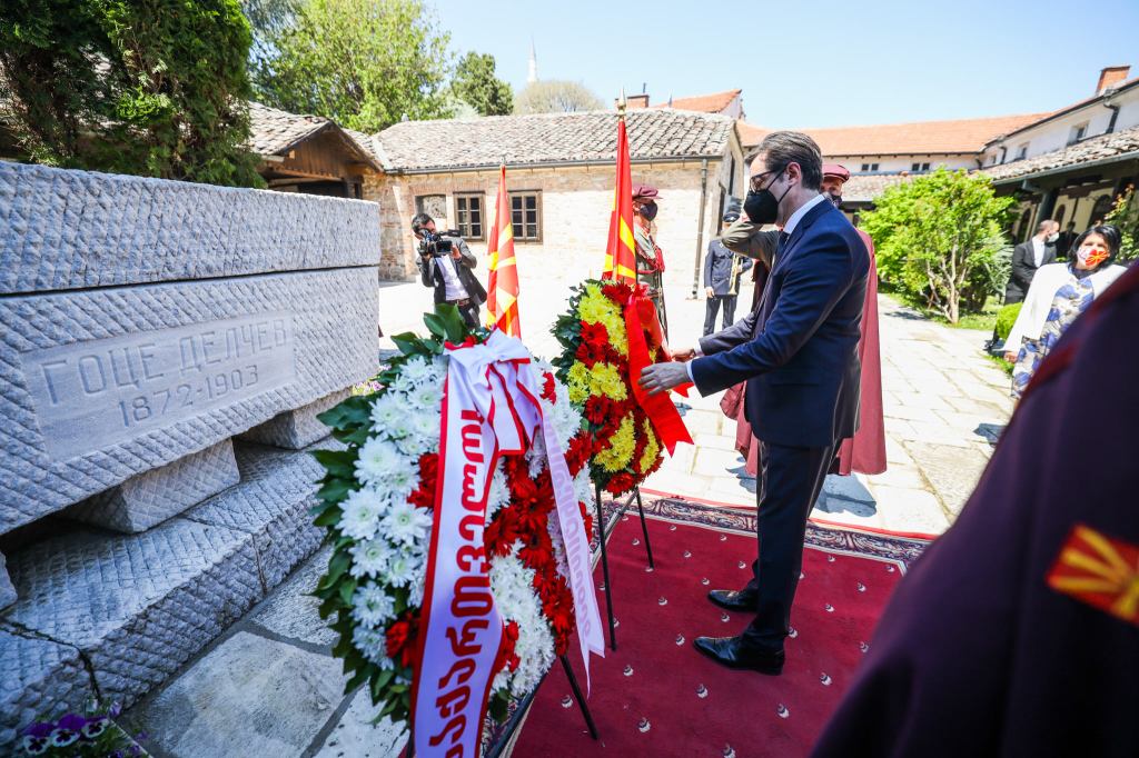 Со სალომე ზურაბიშვილი / Salome Zourabichvili денеска положивме цвеќе на гробот на македонскиот револуционер Гоце Делчев, во Св. Спас во Скопје. Црквата е еден од најзначајните споменици на културата. Значаен артефакт е имресивниот дрвен саркофаг изработен од копаничарот Нестор Алексиев Мирчевски. Во него биле донесени моштите на Делчев. ![]()