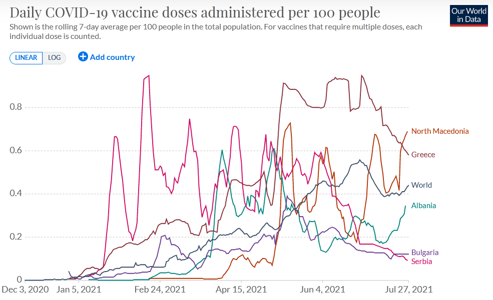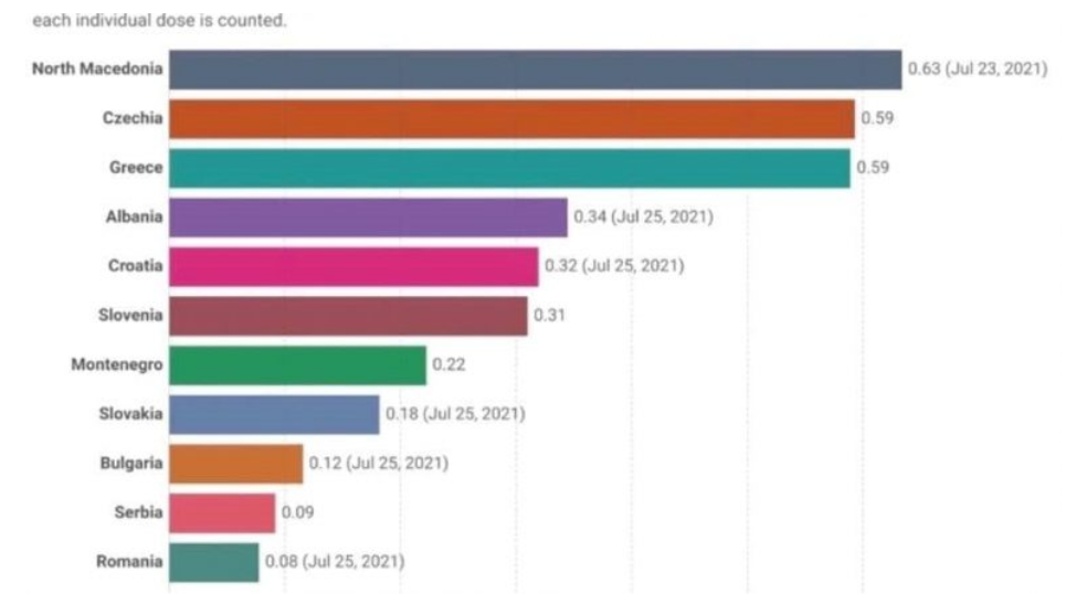 Според светските податоци, земјава само на 23 јули вакинирала околу 0,63% од населението. Во Грција биле вакцинирани 0,59%, Бугарија 0,12%, додека Србија 0,09%.