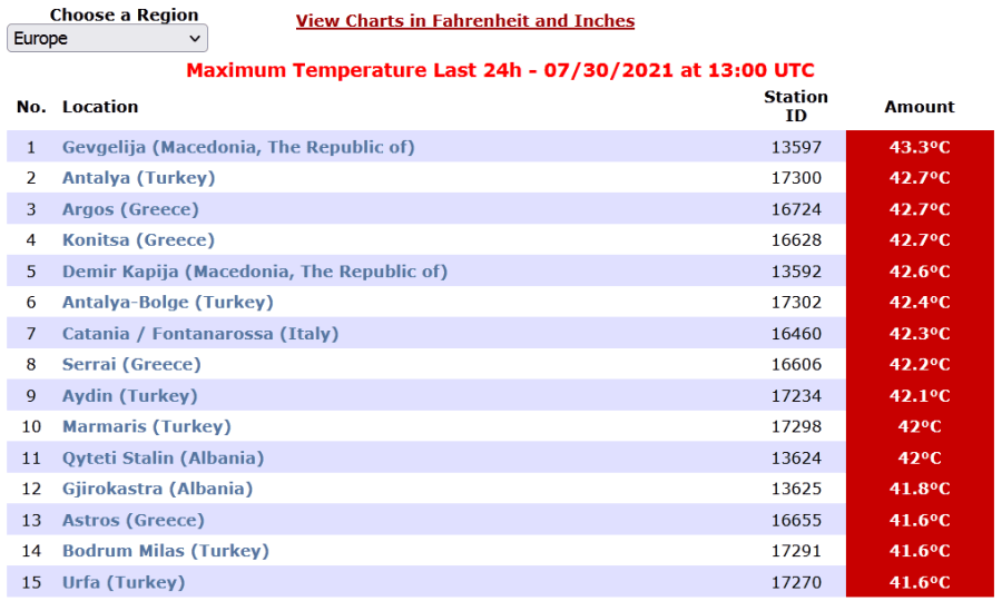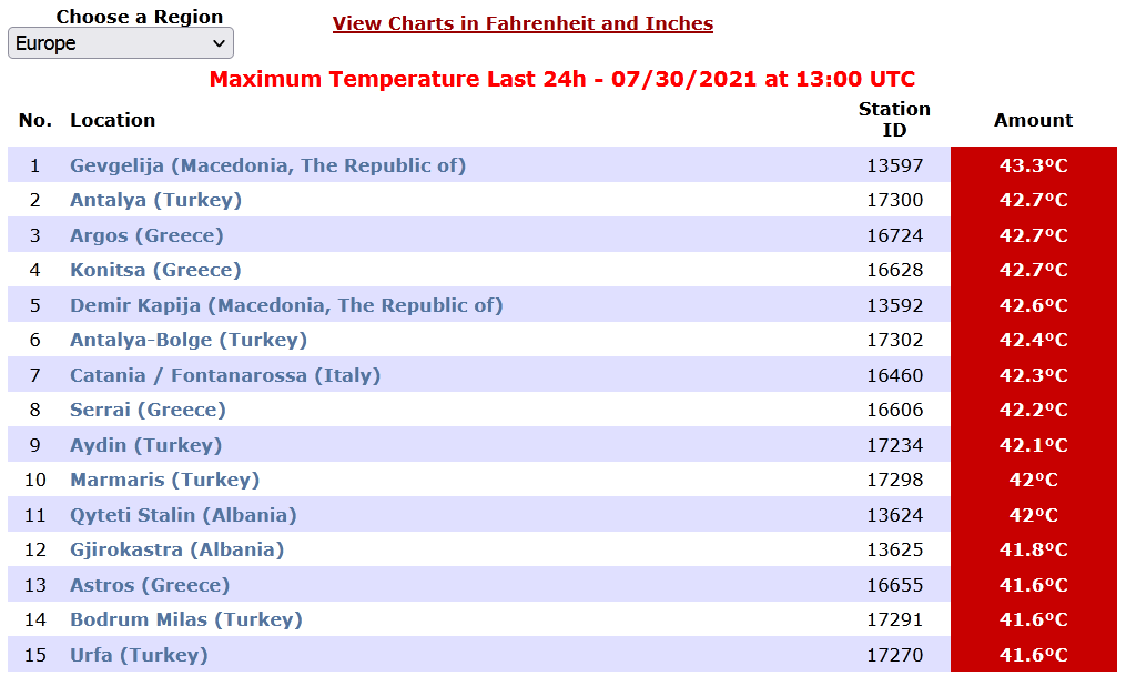 Вчера во Гевгелија беа измерени 43,3 степени целзиусови, со што беше и најтопол град во Европа. Освен Гевгелија и Демир Капија се најде на листата на 15 најтопли градови каде со 42,6 степени беше на петото место.