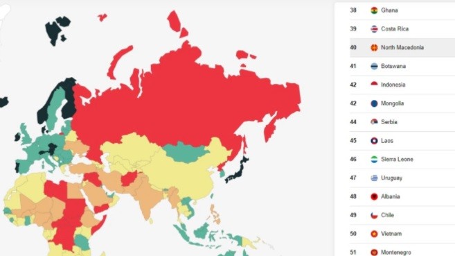 Земјава годинава има напредок од 11 позиции во однос на лани и е рангирана на 40. место. Пад од три позиции, има Србија и таа се најде на 44. место и Албанија со пад од 2 позиции на 48. место, а мал скок имаат Црна Гора (51. место) и Босна и Херцеговина која е на 72. место. Косово си ја задржа својата позиција на 82. место.