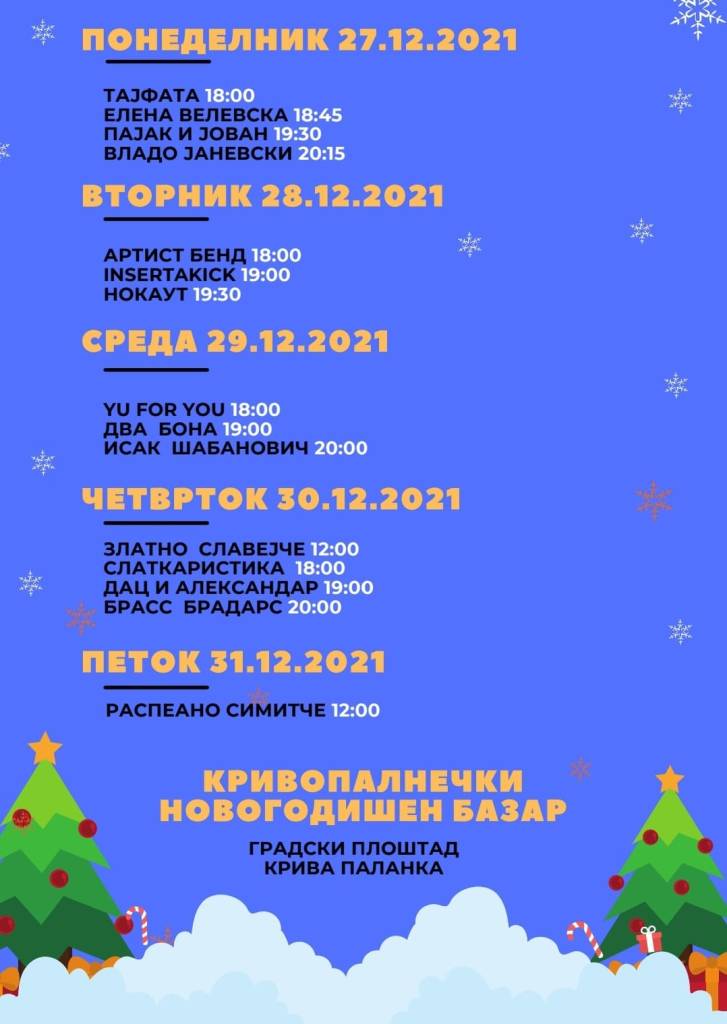 -Во духот на празнувањата и новогодишната магија што ги развеселува граѓаните и ќе ги оттргне од секојдневието, особено во периодот на пандемија, што сите нѐ оптоварува, годинава во нашиот град ќе се реализира „Кривопаланечки новогодишен базар”. Програмата е распоредена во пет дена, во кои е предвидена забава и музика, веселба и атмосфера за расположение на сите генерации. Во деновите што претстојат моите сограѓани ќе ги забавуваат едни од најдобрите домашни и регионални ѕвезди, меѓу кои: Владо Јаневски, Нокаут, Елена Велевска, „ЈУ фор ју”, Слаткар, дуото Александар и Дац и многу други, а добредојдени се сите љубители на добра музика и забава од регионот и државата, изјави градоначалникот на Општина Крива Паланка, Сашко Митовски.