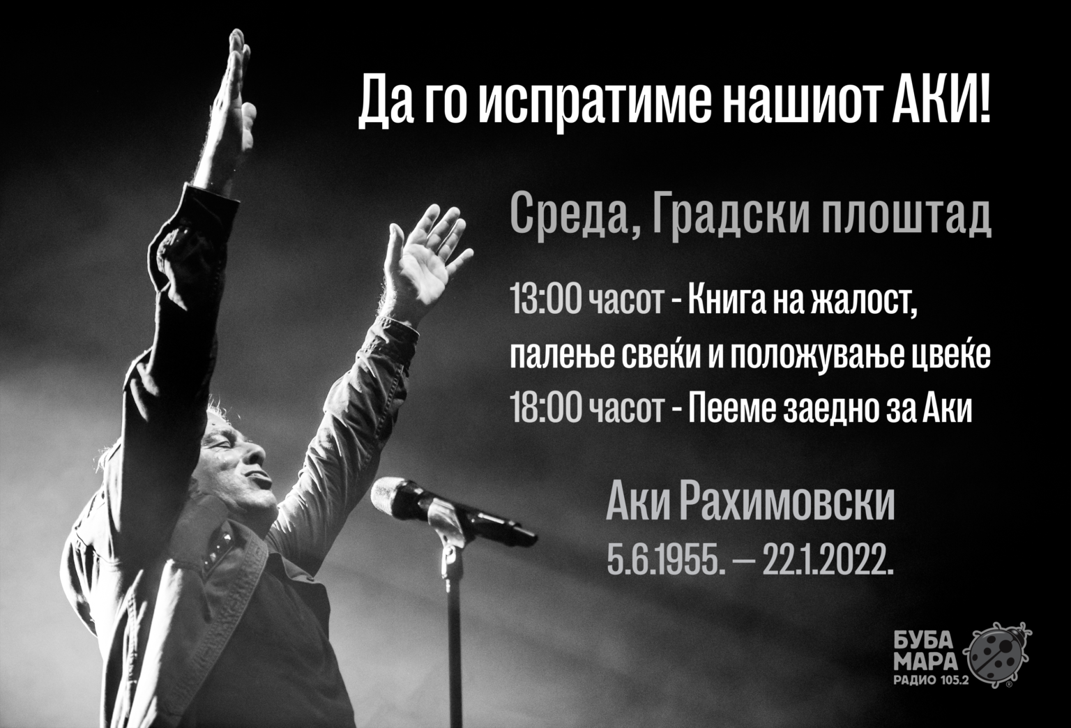Последното збогување со Аки Рахимовски го организира Радио бубамара со поддршка КЛС Саунд и Град Скопје. На Градскиот плоштад ќе ја слушнеме и песната „Ако згрешам, нека изгорам“ на Пепи Бафтировски, која Аки во клавирска придружба ја сними пред пет години во студиото на „Тавитјан брадерс“.