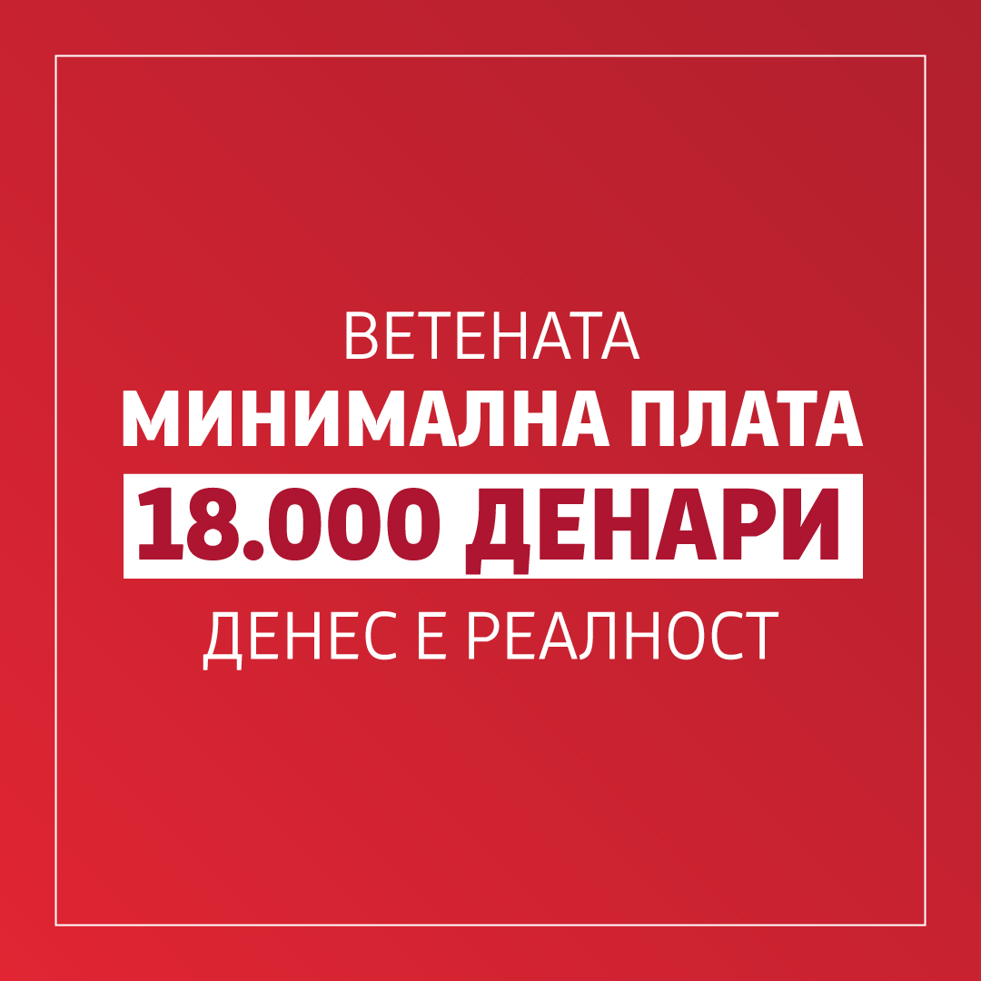 Честитки за нашите сограѓани кои со изгласаниот Закон за минимална плата веќе со мартовската плата ќе можат да го зголемат својот домашен буџет за најмалку 45 евра месечно. Минималната плата од 18.000 денари ќе придонесе кон подигнување на животниот стандард што е наша врвна цел. Сега веќе ќе може платите да растат без дополнителна интервенција, ќе се подига квалитетот на живот на граѓаните и во иднина.