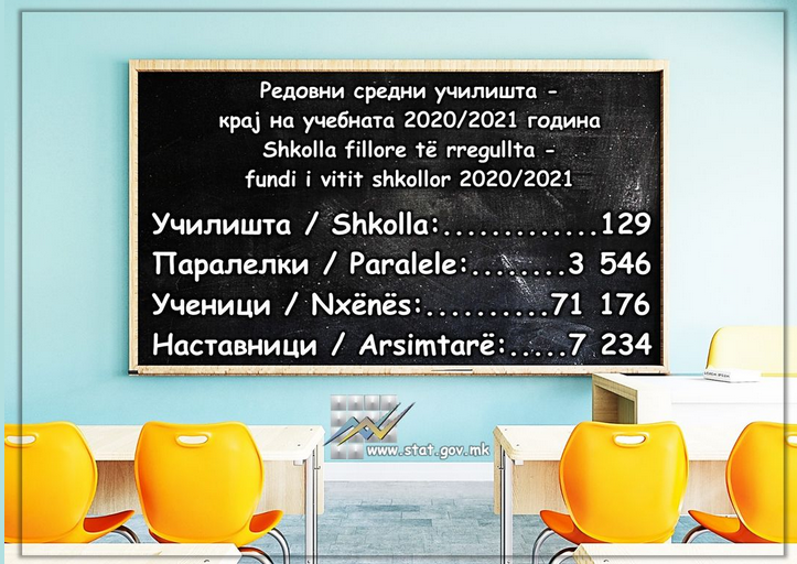 Во редовните средни училишта, бројот на учениците на крајот на учебната 2020/2021 година изнесува 71 176, што претставува зголемување за 4.2 % во однос на претходната учебна година.![]()