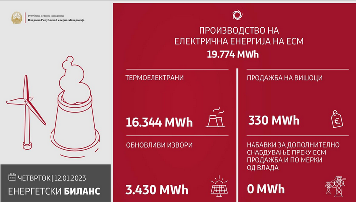 АД ЕСМ на 12.01.2023 година произведe 19.774 MWh електрична енергија, со што целосно ги задоволи потребите на домаќинствата и малите потрошувачи.