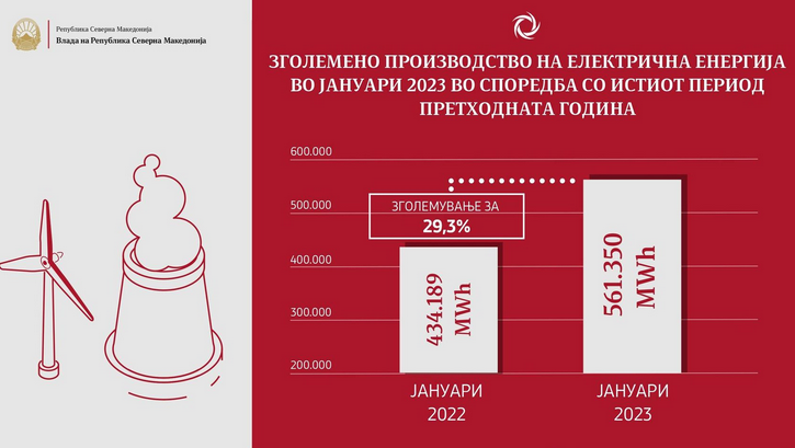 Во јануари за скоро 30% e зголемено домашното производство на електрична енергија во споредба со истиот месец од минатата година.