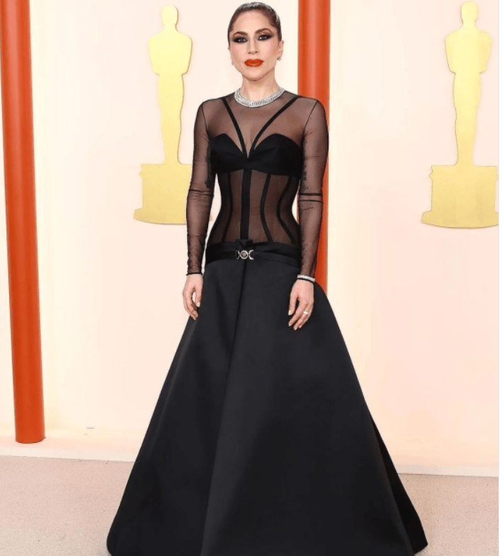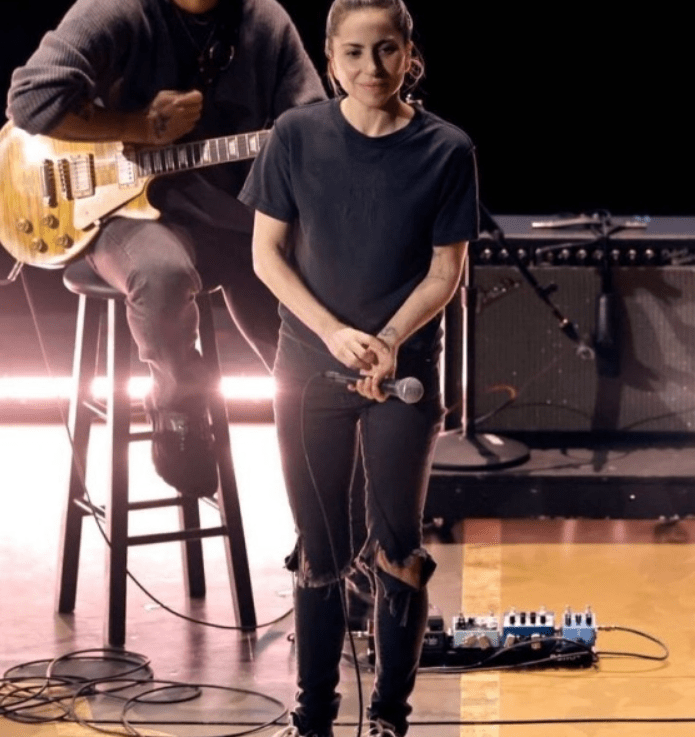 36-годишната пејачка пристигна на свеченоста во атрактивна проѕирна креација од Версаче и гламурозна шминка. Но, за изведбата на сцената, Гага целосно ја избриша шминката и облече едноставна модна комбинација која се состоеше од фармерки и црна маица.