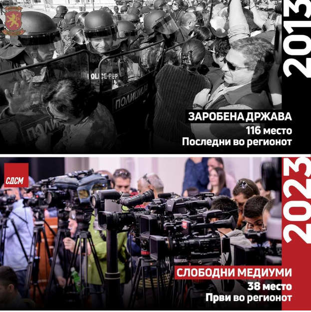 Рангирањето на земјите според слободата на медиумите во 2023 година покажува дека земјава, со заземање на 38. позиција од вкупно 180, е лидер по слободни медиуми во однос на земјите на Балканот. Освен што е најдобро рангирана, по Црна Гора, земјава има најдобар напредок на ова поле во однос на земјите од Западен Балкан, споредено со рангирањето од минатата година