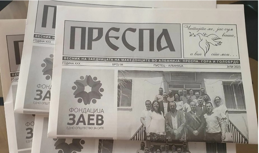 „Деновиве логото на фондацијата „ЗАЕВ – Едно општество за сите“ се најде на насловната страна на најновиот (јулски) број на „Преспа“ – весник на заедницата на Македонците во Албанија, како сведоштво за поддршката на нашата фондацијата за понатамошното редовно излегување на овој весник. На тој начин, фондацијата го помага информирањето на Македонците во Албанија на македонски јазик, а со тоа и активностите на заедницата на Македонците во нашиот западен сосед, кои се во функција на афирмација на македонскиот етнички, јазичен, културен и верски идентитет, како и унапредувањето на нивните положби и права“, објави Фондацијата „Заев“