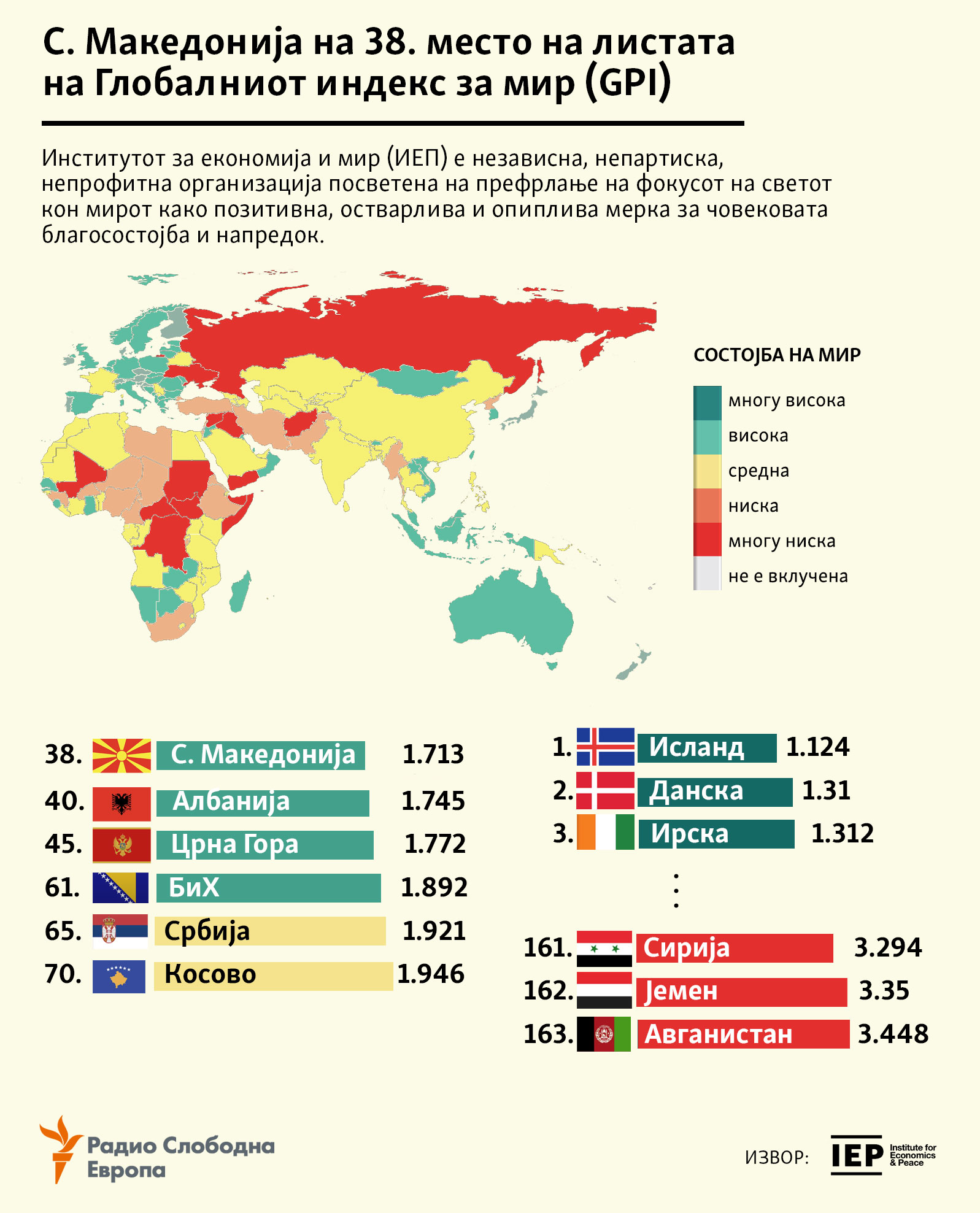 Северна Македонија е на 38. место на листата на земји според Глобалниот индекс за мир