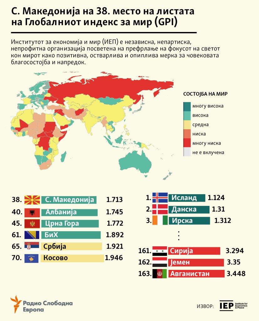 Од земјите во регионот С.Македонија е на 38-то место а потоа на листата следуваат Албанија на 40-тото, Црна Гора на 45-то и Босна и Херцеговина на 61-то место како земји со висока состојба на мир. Србија на 65-тото место и Косово на 70-тото се во група на земји со средна состојба на мир. Словенија е на високото 8 место на листата, а Хрватска е на 14-тото место како земји со многу висока состојба на мир.