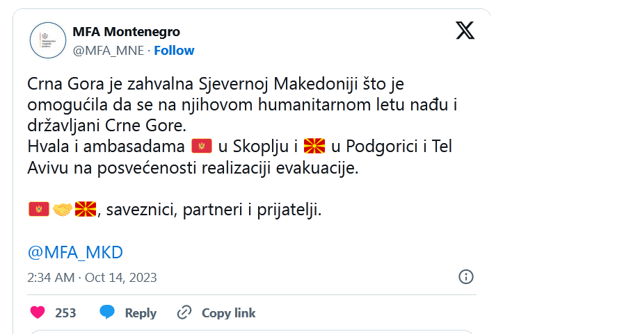 „Црна Гора и е благодарна на Северна Македонија што им овозможи на црногорските државјани да бидат на нивниот хуманитарен лет. Благодарност и до амбасадите на Цена Гора во Скопје и македонските амбасади во Подгорица и Тел Авив за нивната посветеност за реализација на евакуацијата. Северна Македонија и Црна Гора, сојузници, партнери и пријатели“, пишува во објавата на Х од Министерството за надворешни работи на Црна Гора.