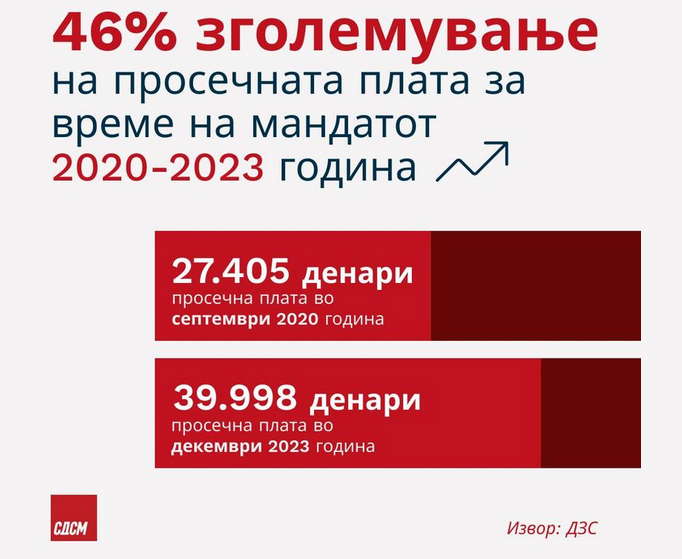 Во септември 2020 година мандатот го започнавме со ветување дека просечна плата од 27.405 денари ќе ја зголемиме за 30%, односно дека ќе изнесува 35.000 денари. Ова ветување кон граѓаните го исполнивме уште минатата година во март, а сега, согласно последните податоци на Државниот завод за статистика(ДЗС) за декември, сме постигнале резултат кој е повисок за 16 проценти поени од тоа што сме го ветиле, сме ја зголемиле просечната палта за четири години за 46% или за речиси 14.000 денари(или точно 13.986 денари)