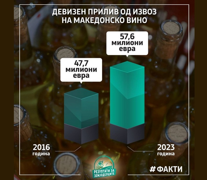 Денес како држава бележиме 57,6 милиони евра девизен прилив од извозот на македонско вино, за разлика од 2016 година кога девизниот прилив изнесувал 47,7 милиони евра.