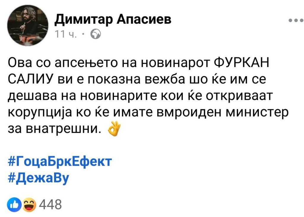 Апасиев: Апсењето на Фуркан е показна вежба шо ќе им се дешава на новинарите кои ќе откриваат корупција ко ќе имате вмроиден министер за внатрешни 8Apr 2024Add a comment Апасиев на ФБ: Апсењето на Фуркан е показна вежба шо ќе им се дешава на новинарите кои ќе откриваат корупција ко ќе имате вмроиден министер за внатрешни СподелиTweetLike Loading...